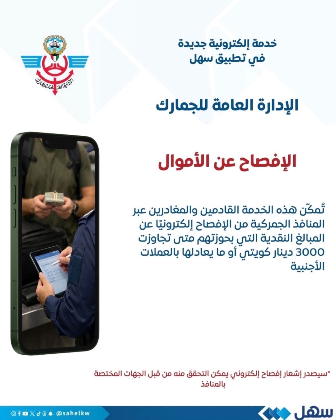 (الإفصاح عن الأموال) ليتمكّن القادمين والمغادرين عبر المنافذ الجمركية من الإفصاح إلكترونيًا عن المبالغ النقدية التي بحوزتهم متى تجاوزت 3000 دينار ...