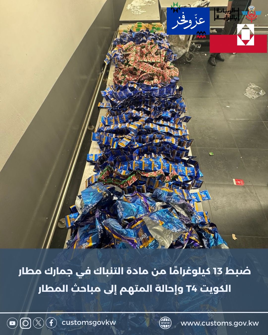 تمكنت الإدارة العامة للجمارك - ادارة المطارات من ضبط مسافر من الجنسية الهندية بحوزته كمية من مادة التنباك، وذلك في مطار الكويت (T4) وتفصيلاً، فقد ق ...