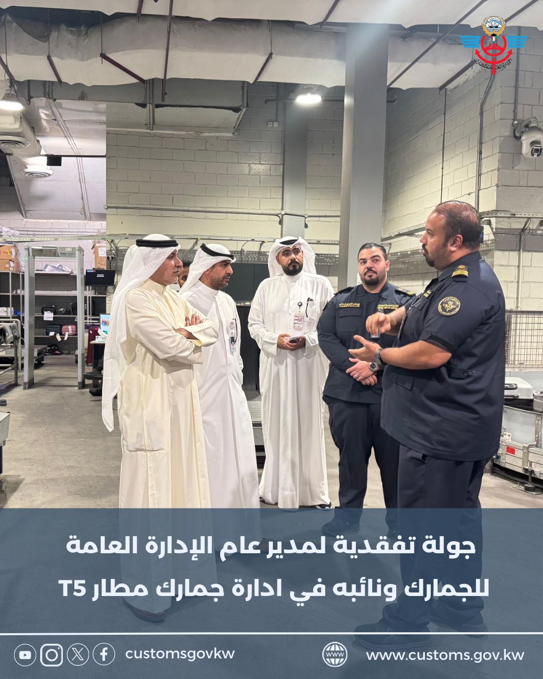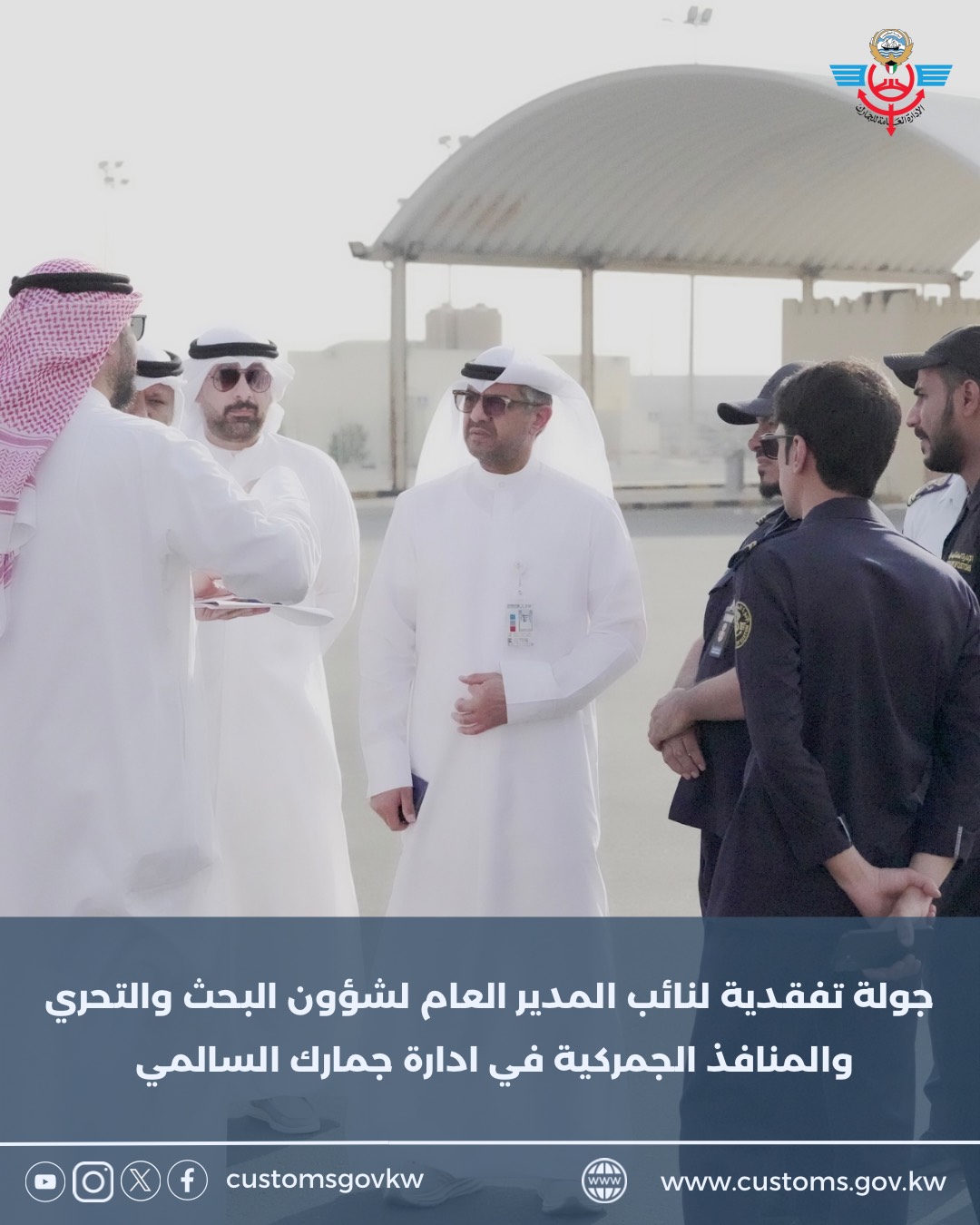 في إطار حرص الإدارة العامة للجمارك على المتابعة الميدانية لسير العمل والاطلاع على جاهزية المرافق الجمركية، قام مدير عام الإدارة العامة للجمارك السيد/ يوسف خالد النويف ونائب المدير العام لشؤون البحث و...